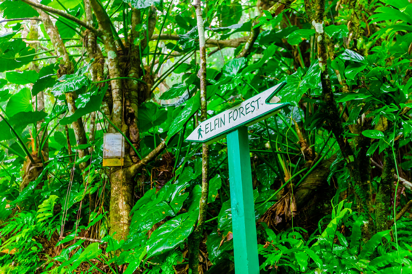 Just below the summit, Mountain Palms, Tree Ferns, Elephant Ears and Heliconias dominate.