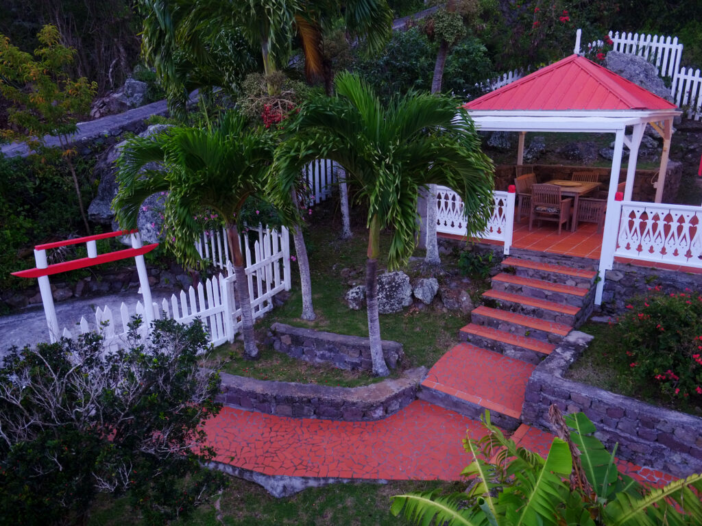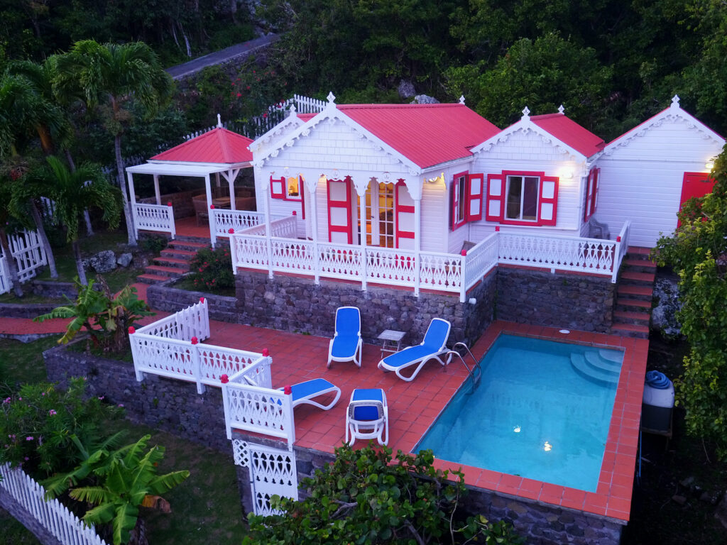 Booby Hill, just a short walk from Windwardside, Flamboyant Cottage is a picture-perfect gingerbread cottage designed for a relaxing vacation. This quaint Saban cottage boasts two bedrooms, each with private bath, well-equipped full-size kitchen, outdoor dining gazebo, private pool, and extensive tiled decks from which you can enjoy the stunning views of Statia, St. Kitts, Nevis and the Caribbean Sea. The cottage is decorated in bright Caribbean colors and furnished with comfort in mind, including overhead fans, flat-screen cable TV, DVD player, Bluetooth speakers, and Internet access