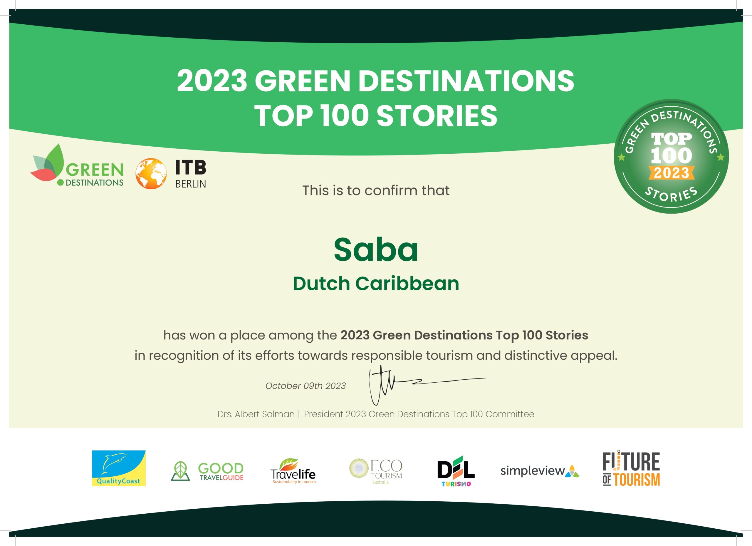 In the realm of Green Destinations, Saba has been honored with the prestigious 2023 Top 100 Stories recognition. This distinction specifically highlights our Coral Nursery project, a pioneering endeavor that showcases our dedication to sustainable tourism and the preservation of our unique appeal. (For more details on the Coral Nursery project, please refer to the attached link: https://www.greendestinations.org/saba-dutch-caribbean/).