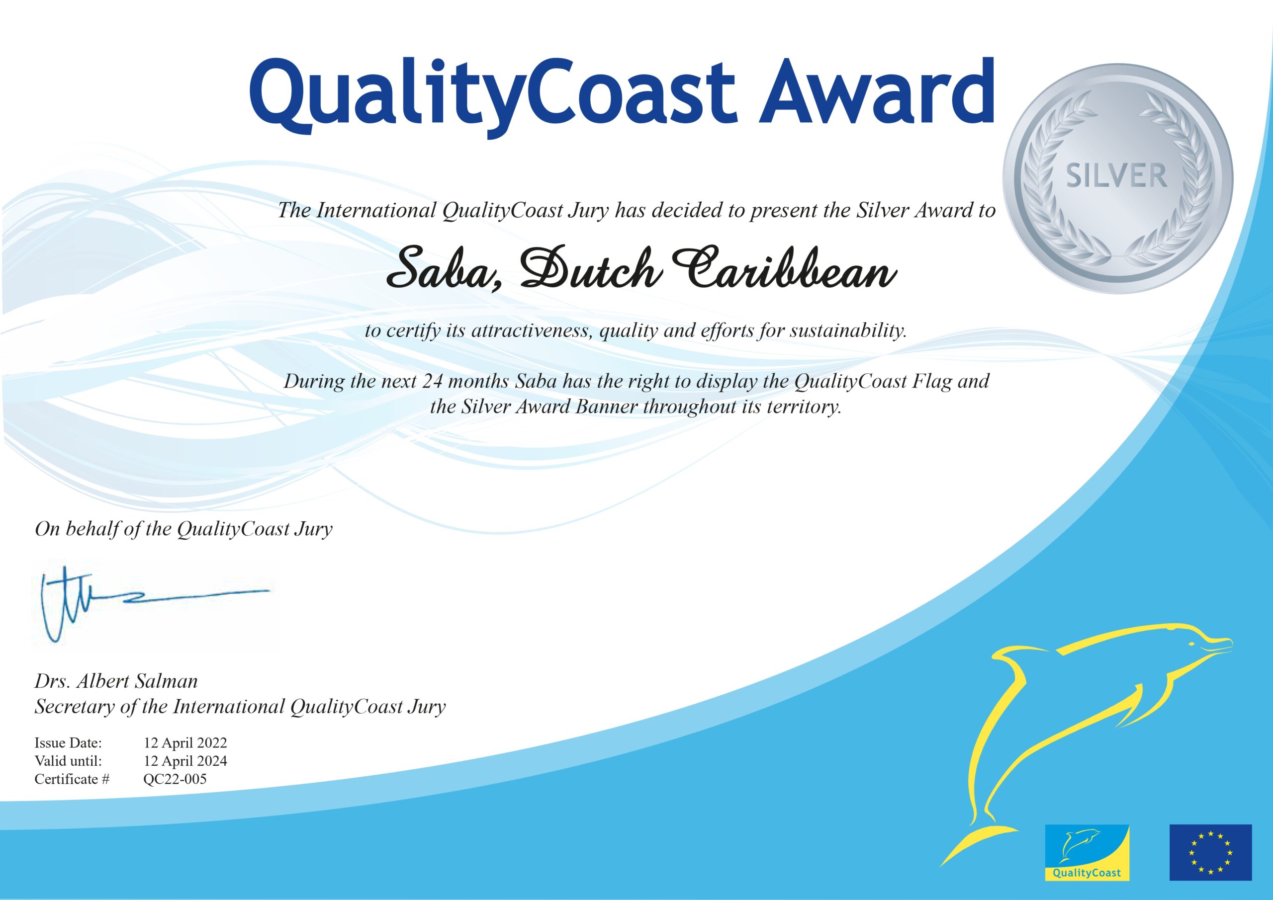 Saba has received the Silver QualityCoast Award indicating excellence in all fields of sustainable destination management such as nature and heritage conservation, waste management, energy and climate.