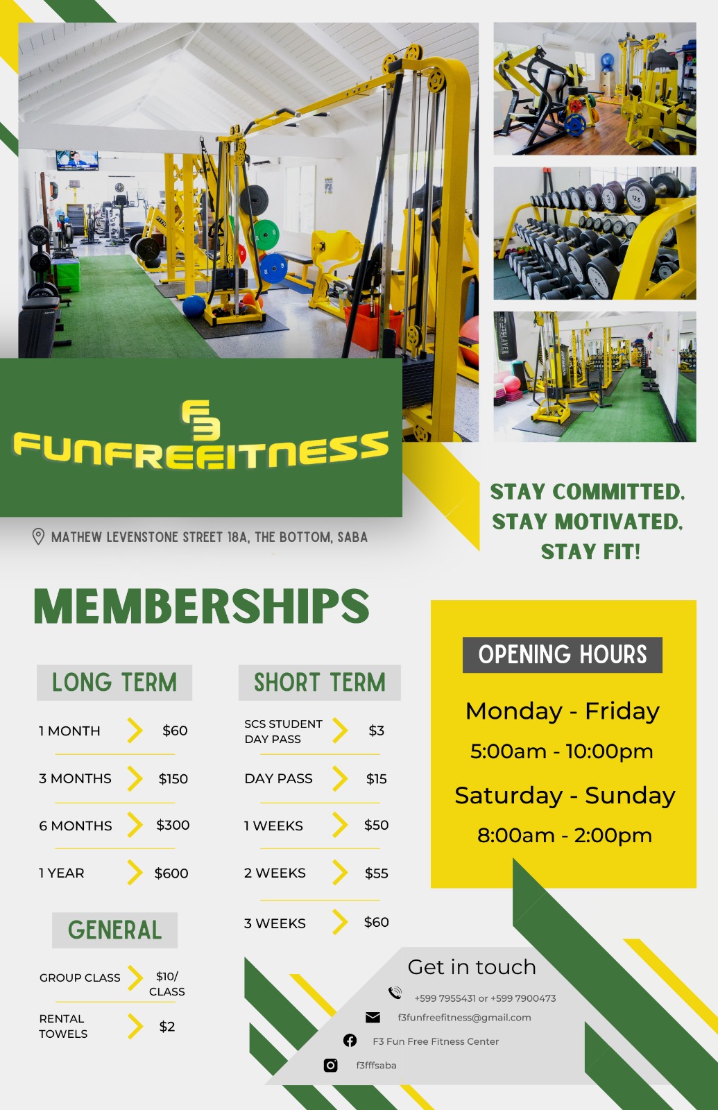 F3 Fun Free Fitness Center has a range from cardio, strength training and basic fitness levels. The center is opened from Monday to Friday from 5 a.m. to 10 p.m., and on Saturday and Sunday from 8 a.m. to 2 p.m. F3 Fun Free Fitness Center has customer service during the opening hours in the day. Persons, both residents and visitors, can walk in for information.